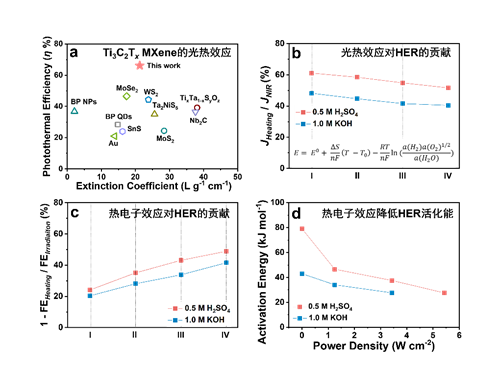 近日,大连理工大学精细化工国家重点实验室王治宇教授、邱介山教授与中科院大连化物所吴凯丰研究员合作,基于MXene的独特结构与物理性质,在外源电场驱动下,以电化学催化析氢反应为探针,研究揭示了不同化学组成与晶体结构的MXene(如Ti3C2Tx,V4C3Tx,Nb2CTx)之LSPR效应的产生机制以及对电化学催化反应过程的强化作用原理。他们利用飞秒激光技术,发现MXene在可见-近红外光谱区域的LSPR效应导致显著的光热转化与亚皮秒级热电子效应;其中,光热效应通过提供热能与降低浓差极化,降低了析氢反应的过电势,而热电子注入效应则更利于降低析氢反应的活化能。在不同pH环境中与光辐照条件下,这一耦合强化机制可使MXene的电催化析氢活性提升5倍以上。这一工作有机融合了凝聚态物理、光学、化学与材料等交叉学科的技术与原理,为发展新型高效光电响应催化材料新体系提供了新的思路。