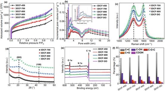 图2. 三维碳材料的孔结构和表面性质研究:(a) 3DCF材料的氮气吸脱附等温线。(b) 3DCF碳材料的孔径分布。(c, d) 3DCF材料的XRD及Raman分析。(e) 3DCF材料的XPS分析。(f) 不同温度及脱氧前后3DCF材料的氧官能团种类的变化。