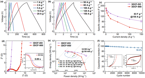 图4. 三维碳材料作为离子液体系4 V高压超级电容器电极材料的电化学性能研究:(a, b) 3DCF材料的恒电流充放电曲线。(c) 3DCF碳材料于1-150 A/g电流密度下的倍率性能。(d) 3DCF材料的Nyquist图与Bode相图。(e) 3DCF材料的Ragone谱图。(f) 3DCF材料的循环性能。
